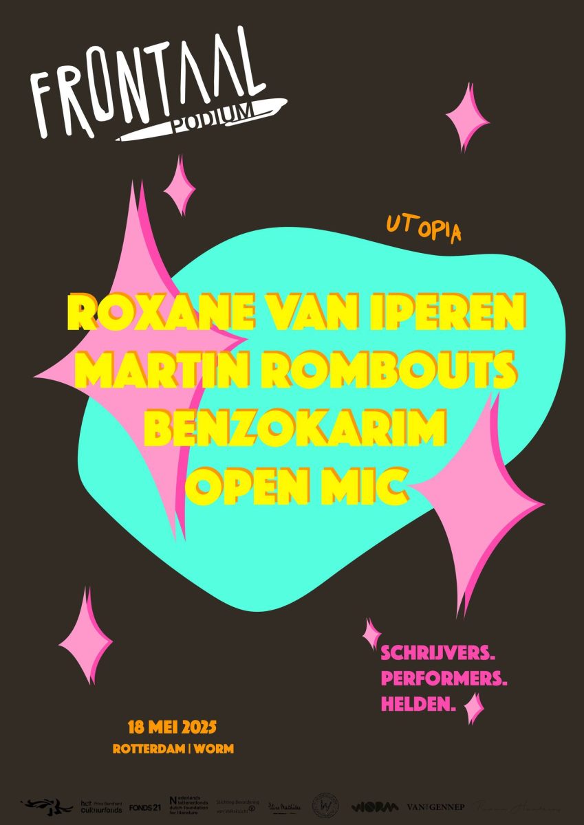 Bruisend van de nieuwe ideeën presenteert Frontaal de volgende editie: Utopia. Want laten we eerlijk zijn: die wereld van ons kan wel een upgrade gebruiken! Met Roxane van Iperen, Benzokarim, Martin Rombouts én de deelnemers aan de Open Mic keren ze terug naar de tekentafel, stippelen ze routes uit die ons naar de ideale werkelijkheid brengen. Eentje waarin een klomp goud net zoveel waard is als een gedicht. Ontdek de nieuwe wereld op 18 mei!